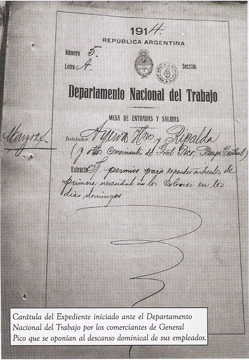 "Una lucha más que centenaria" Roberto "Homero" González, larroudense por adopción, conocido de los piquenses por su labor periodística en medios gráficos y radiales y actualmente propietario de un taller gráfico artesanal, en el marco del 9no encuentro de Historiadores de los Pueblos del Norte de La Pampa, realizado en General Pico en Noviembre de 2015, presentó un trabajo que, a modo de homenaje a los anfitriones aborda un aspecto recurrentemente presente en nuestra historia local: la vieja disputa de los empleados de comercio en pos de obtener su merecido descanso dominical, que bajo el título de "Una Lucha más que Centenaria" empieza de esta manera: "Señor Presidente, ¿cómo es posible que mis pares no comprendan la necesidad de un día de descanso, cuando Dios hizo el mundo en seis días y descanso el séptimo?"(*1) (Argumento utilizado por Alfredo Palacios (*2) en el debate dado en la sesión de la Cámara de Diputados durante la cual se aprobó la Ley de Descanso Dominical) "La prohibición de trabajar los días domingo fue el primer proyecto de Alfredo Lorenzo Palacios, un joven legislador socialista por el Barrio de la Boca, quien mantuvo durante casi un año de arduo debates intentando doblegar la resistencia conservadora de sus pares, - lucha que protagonizó en la soledad más absoluta- hasta que en la sesión del 31 de octubre de 1905, utilizó argumentos tan convincente que provocó el aplauso generalizado de los diputados presentes y lograra aprobación del proyecto promulgado como ley 4661 que en principio rigió sólo para el ámbito de la Capital Federal. Recién en el año 1913 -por Ley 9104- se amplió sus alcances a los, por ese entonces, territorios nacionales y la subsiguiente (N° 9105) extendió el descanso obligatorio a los feriados nacionales. Lo que a todas luces era un avance en los derechos de los trabajadores no tuvo plena aceptación e incluso, en muchos casos, género gran resistencia de parte de los comerciantes. Lograr su cumplimiento a sido una lucha, la mas de las veces infructuosa, que durante más de 100 años han mantenido las organizaciones sindicales. En nuestra provincia, el primer conflicto no tuvo una mayor trascendencia pero -aún con intermitencias- fue el que tuvo mayor duración si tenemos en cuenta que se solucionó apenas seis meses antes de que cumpliera 100 años. En efecto, se inició el 15 de marzo de 1914, cuando un grupo de comerciantes de General Pico -Ayerra Hnos y Ripalda (*3), Molinos del Oeste SA, Moscoso Hnos, Santiago Sueta, Fadriane Hnos, Romera Hnos y Leandro Navilli-, se dirigieron al Presidente del Departamento Nacional del Trabajo Dr. Julio B. Lezama, solicitando una excepción de la norma descanso dominical para permitir la atención a los "agricultores y chacareros que viven a grandes distancias y que todos los días hábiles están dedicados por completo a las tareas agrícolas" con la intención de facilitarles es el expendio de "artículos de primera necesidad, combustible y repuestos de maquinas agrícolas", entre otros argumentos de similar tenor. Enterados de esta petición de los comerciantes, el Centro de Empleados de General Pico -que había sido fundado un par de años antes (*4)- a los pocos días, más precisamente el 24 de ese mismo mes y año, se dirigieron a la misma autoridad nacional transcribiendo y refutando el petitorio de los comerciantes en un extenso escrito de 7 páginas. Acompañaban a su presentación, además de una copia de su estatutos, los avales otorgados por los trabajadores de 59 firmas comerciales con asiento en localidades pampeanas tales como Alpachiri, Ataliva Roca, Cura-Co, Gral. Acha, Guatraché, Ivanousky, Unanue, Villa Alba o Santa Rosa entre otras. En el amplio nivel de respaldo a la gestión sindical se registraron algunas notorias ausencias: B. Larroudé, Intendente Alvear, Realico o Macachín, por ejemplo. La extensa presentación firmada por Isaac Adler (*5) y Aurelio Marti (*6), en su calidad de secretario y presidente de la entidad gremial, respectivamente, apelo a todo tipo de argumentos. Entre otros, trajeron a colación, a título de ejemplo, que la firma Serralta, Taravella y Cía. de Trenel "no ha abierto ni un solo domingo y nadie se ha quejado", al tiempo que aclaraba que en Pico ya no existen agricultores ni colonos a grandes distancias por la proliferación de nuevos poblados periféricos como Metileo, Monte Nievas, Dorila, Speluzzi o Vertiz. También señalaron que, bajo el imperio de la ley de descanso dominical, se había efectuado "toda la cosecha 1913/1914 sin protesta por parte de los colonos" al tiempo que advertía "...si se abre los domingos se terminan vendiendo toda clase de artículos y no sólo los de primera necesidad". Reflexiona mas adelante la entidad gremial "De accederse a lo peticionado por los comerciantes se daría el caso curiosísimo de que nuestros legisladores y nuestros gobernantes de habrían desvelado y trabajado en formular una ley justa y necesaria para que los comerciantes dejen artificiosamente una Ley en pie y se burlen de ella pudiendo por la misma ley de trabajar durante el día que la ley prohíbe". Ya sobre el final, Adler y Martí se preguntan "¿No es justo que tras un trabajo de 14 horas diarias se nos otorgue un día descanso?" Finalmente, luego de un burocrático recorrido del expediente por diversas dependencias del gobierno nacional, se dispuso el archivo de las actuaciones con el fundamento de que la cuestión había quedado zanjada con la nueva reglamentación de la Ley de Descanso Dominical para los trabajadores de los territorios nacionales. En rigor de verdad la única variante introducida por dicha norma legal era la que preveía que "...los que ejecuten trabajos en días domingo, de acuerdo con las excepciones autorizadas, gozarán de un día de descanso en la semana subsiguiente". La redacción del listado de actividades susceptibles de ser incluidas en esas excepciones era tan laxo que daba lugar a