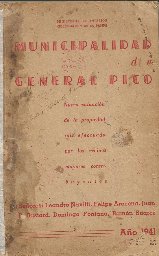 NOMENCLATURA 1941 General Pico desde su fundación, o al menos desde que comienza a funcionar la Municipalidad, tiene 227 manzanas en su ejido original y ellas se encuentran en una cuadrícula marcada entre las calles 1, 32, 33 y 2. La número UNO (1), es la que se encuentra entre las calles 1, 4, 3 y 2 (siempre haremos la lectura en el sentido de las agujas del reloj) De acuerdo al Boletín emitido por la Municipalidad, dependiente del Ministerio del Interior de la Gobernación y por el estudio realizado por los señores Leandro Navilli, Felipe Arocena, Juan P. Bastard, Domingo Fontana y Ramón Suarez, en el año 1941, podemos hoy reconocer a quienes pertenecían cada uno de los lotes. En muchos casos habitados por los mismos dueños, en otros casos alquilados o simplemente permanecían como baldíos. Cada una de estas manzanas fueron diagramadas en forma idéntica y el corte de las mismas no diferían para nada, salvo aquellas que estaban alrededor de la plaza España o las que estaban (siguen igual), desde calle 24 hasta 32entre 17 y 19, como así también desde la 10 hasta calle 2. Otras aún más diferentes eran y son las que comprenden las vías del Ferrocarril y la calle 21, desde la 24 hasta la 32. A todo esto debemos decir que la manzana que lleva el número 227 es la que queda entre 31, 32, 33 y 30. Podemos ver en las figuras adjuntas, que esa numeración obedece a un patrón que comienza desde calle 2 hasta la 32 y continúa desde allí hasta la 2, siguiendo hasta calle 32 y así sucesivamente, mientras que cada lote comienza con la letra A que sería el lote que marca la esquina de 1 y 2 y así continuando en el sentido de las agujas del reloj hasta completar con la letra L que marcarían los 12 lotes en que estaban divididos. (Ver copia adjunta). Las esquinas tenían una medida de 35 metros por lado, mientras que los dos centrales eran de 15 metros de frente. Los que daban a las calles impares tenían 50 metros de fondo y sobre las pares 35. Luego fueron apareciendo, –de acuerdo a las necesidades–, medidas diferentes. Presentadas estas “curiosidades”, podemos ahora mostrar los propietarios de esas tierras, aunque no debemos olvidar un patrón regular del valor de esas tierras: A $472.- B $337.- C $337.- D $567.- E $378.- F $378.- G $567.- H $405.- I $405.- J $567.- K $315.- L $315.- XXXXXXXXXX Quiero aclarar que este listado por ser extenso, he resuelto hacerlo en varios tramos para no cansar al lector. La primera parte corresponde a la cuadrícula primaria que se encuentra entre las calles 1 y 19, 2 y 32, con un total de 149 manzanas. A continuación de este trabajo, podremos encontrar al resto de los vecinos que tenían sus terrenos, –algunos edificados–, de los primeros años de 1940. XXXXXXXXXX Manzana Nº 1, ubicada en 1, 4, 3 y 2 A Tomás Chavez B a L Amalia S. de Pico. No se registra adelanto alguno. Manzana Nº 2, por calle 1, entre 4 y 6 La misma era propiedad del señor Augusto Utermann. No se registra ningún tipo de edificación. Manzana Nº 3, entre 6 y 8, es propiedad del señor Juan Williamson y solamente registra edificación el lote A. Manzana Nº 4, era la que pertenecía al Hospital Gobernador Centeno. En la actualidad se encuentra el “Centro Penitenciario”. Manzana Nº 5, entre 10 y 12. A L. Herrea y otros B y C Pascual Bacigalupi D 1ª Pedro Guaraglia D 2ª Emilia E. de Bruni E Juan Guaraglia F y G José Gallerati H e I Francisco Malvicino J1ª María M. Mortellono J2ª Ricardo P. Lavalle K y L José Bragulat Manzana Nº 6 entre 12 y 14 A hasta L; Pertenecía al señor Domingo Fontana y no se registraba edificación. Manzana Nº 7 entre 14 y 16 A, a L, Pertenecía en su totalidad al señor Ángel Larrea y no se registra ninguna edificación. En este lugar, –según puede rescatarse–, se disputó en abril de 1945, un partido trascendental para dos equipos de fútbol, uno para mantenerse en la categoría superior y el otro para subir a primera después de haber ganado ese derecho, el de segunda o ascenso. Pico Fútbol era el equipo de primera, puesto que los resultados no les fueron nada favorables y se vio obligado a este partido decisivo con el equipo de los hermanos Alfredo, Armando, Anibal y Alberto Campos, Boca Juniors, con muy pocos años de formación. A raíz de esta caída solamente pudo sostenerse por algunos meses. Ese partido terminó con tres (3) goles para el Decano, y dos (2) para Boca Juniors. Queda también hecha la aclaración que los hermanos Campos pasaron luego a las filas de Pico Fútbol, pasando a ser deportistas de la entidad y grandes colaboradores después. Manzana Nº 8 entre calles 16 y Boulevard Alsina (Av. San Martín) Al igual que la anterior están ubicadas frente al Estadio de Independiente y los dueños de los solares, son los que conoceremos a continuación: A Máximo y L. Martín B Antonio Martín y Señora C Lucas Ullúa D Petrona Quiroga E Vicente S. Tellería F Salvador Esteban G José M. Calderaro H1ª José M, Quintela H2ª Juan Fernández I Ernesto Hirreberrondo J Visitación Haedo K Bonifacio Leguizamon L Máximo y L. Martín Manzana 9 entre Boulevard y calle 18 A1ª Domingo Pesce A2ª Ramón N. Diez B Anibal González Ordoñez C José Viscardis D1ª José A. Rodríguez D2ª Felipe H. Nicola D3ª “ “ D4ª Francisco Barón Barón. E Miguel Beltramone F Alberto Guaraglia G Mateo C. Meza H, I1ª, I2ª Francisco A. Libe J1ª y 2ª Domínguez y Rossi K Fernando Bujedo L1ª Graciana M. de Guallart L2ª Fernando Bujedo Manzana Nº 10 entre 18 y 20 A a L Pertenecía íntegramente a la firma Apis S. A. y no se registra edificación alguna, aunque llama la atención el aumento de las tierras en relación a la manzana número 1. Manzana Nº 11 es propiedad de la Asociación Española de S. M. Manzana 12 la ubicada entre 22 y 24. A1ª Aquí vivía el recordado Pedro Ricagno, o Gorra Blanca. A2ª y 3ª Nino Caraffini B y C José Ricagno D Felix Yacaruzo E Demetrio Ociats F Ualdegaray y Rodríguez G José