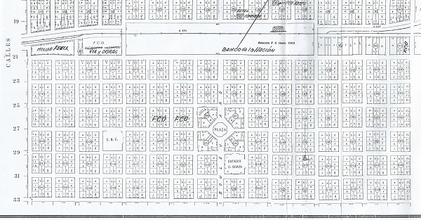 NOMENCLATURA 1941, II Parte Continuando con la lectura de las manzanas que están ubicadas “del otro lado de las vías”, aunque son muchos los que cuestionan ese tema, ya que “el grueso” del pueblo se formó a espaldas del edificio de la Estación Ferroviaria, que por otro lado se repite en otras poblaciones. De cualquier manera no es un tema este para discutir, ya que tampoco es un tema que exija demasiado cuestionamiento, al menos en mi modo de ver. Aquí podemos ver que el pueblo por aquellos años terminaba en la calle 33 y los predios o manzanas que estaban marcadas entre las calles 21 y vías del ferrocarril, (tal como se puede ver en el mapa) tienen unas mediciones muy particulares. Esta segunda parte tiene varios arreglos, uno es la incorporación del croquis de una manzana, que bien puede ser el recorte original de los lotes. Este fue un aporte del amigo Carlos Dante Ismael, a quien le agradecemos infinitamente esta colaboración. Por este croquis corregimos las medidas y los de cada esquina pasarían a tener 35 x 30, mientras los lotes de las calles pares (E,F y K,L) cambiarían a 20 x 35. Otro arreglo es que la cantidad de manzanas eran 242, en lugar de 227, finalizando su conteo 31,33, 4y2. Hecha la aclaración y el agradecimiento correspondiente, continuamos entonces con la anterior descripción de los dueños de los solares por aquella década d 1940. Manzana 143 entre 32-30 y calle 21 con las vías del Ferrocarril A,B,C,D,E Inernacional Harv. C. Manzana 144 entre 30 y 28 A1ª Estéban Ferreyra A2ª Benito Marcos A3ª José Russo B,C, D Ferro C. Oeste Manzana 145 entre 28 y 24 A,B,C1ª E. Grijalba A,B,C2ª D. Ayala A,B,C3ª D. Ayala A,B,C4ª Manuel Anuncio A,B,C5ª West India Oil Co. A,B,C,8ª “ “ “ A,B,C9ª “ “ “ D,E “ “ “ Manzana 146, desde calle 10 hasta la calle 6 F.C.O. (AB) H1ª,2ª,3ª Molinos Fénix S.A. A,B,C,D,E,F,G,H,I Molinos Fénix S.A. Manzana 147, comienza ahora la numeración desde la calle 2 hacia la dirección contraria, ahora entre 21 y 23 A J. Mendoza García B Federico Cid C Amalia S. de Pico D Visitación Haedo E,F,G Eduardo Chapeaurouge H,I Santa Shing J Amalia S. de Pico K Andrés y P. Huerga L Cayetano Mendoza Manzana 148 entre 4 y 6 A Pedro Giachino B,C Alejo Irrazabal D Juan G. Moreno E, E. Chapeaurouge F,G,H,I,J,K,L Alberto F. del Casal Manzana 149 entre 6 y 8 A a L Molinos Fénix S.A. Manzana 150 entre 8 y 10 A,B Pedro Lupani C Luisa V. dd Caire D Luis Giacobbe E1ª Pedro Lupani E2ª Luis Giacobbe F Miguel Fernández G Hipólito Fuentes H Amalia S. de Pico I,J,K Emilio Loinas L Pedro Lupani Manzana 151 entre 10 y 12 A a L Carmen E. Priore Manzana 152 entre 12 y 14 A Simón Abeldaño B,C Dolores Leiva D,E Damonte y meo F Justiniano Murillo G1ª S. Reyes de López G2ª Eduardo Kumkel G3ª Costantini Entizne H Teodoro Guajardo I C. López J1ª Saturnino Nieto J2ª Juan C. Rosa K Antonio Rosa L Domingo Scaglia y Sra. Manzana 153 entre 14 y 16 A José M. Aguirre B,C Juan Dasa D Martín Echeverry E Miguel Soler F,G Francisco Grande H Juan J. Pippia I,J P. Sanutto K,l José M. Aguirre Manzana 154 entre 16 y Boulevard A Santiago Campaso B Manuel Granja D Manuel Pedrerol E Fermín albin F Cayetano Ríos G M. B. de Boichijosky H Juan Martín I Francisco Anzorena J Benigno Saenz K M.B. de Rodríguez L1ª Alfredo Morán L2ª Francisco A. Totino Manzana 155 entre Boulevard y 18 A Pedro Massola B A.T. de Tressen C Gregorio Beytroson D José Barberá E Alfredo Sánchez F Martín Carracedo G Pedro alba H Serafina M. de Jostel I Jorge Álvarez C. M. de J1ª Manuel Blanco J2ª Pascuala Carretero K Miguel Martinez L Teresa Rodríguez Manzana 156 entre 18 y 20 A1ª Francisco & M. Bastida A2ª Antonio Antón A3ª Alfredo Morán A4ª A.S. de Betelu B Antonio Antón C S. López y S. de D Pedro Massola E Miguel Fernández F F.C.L Martín Abarca G Gabriel Toro H Cipriano Casado I Gabino Rodríguez J Juan B. Matos K Domimgo Enriquez L Hilario Pueyo Manzana 157 entre 20 y 22 A Matilde C. de Yañez B Consuelo H. González C P. Rodríguez y Sra. D1ª José Garrido D2ª,3ª T. y Francisco Alonzo García D4ª A.M. de Chicotte y A. E, F1ª Segundo y L. Bonessi F2ª, G T.D y D. Mainz H C. Peñin Cuadrado I Francisco Moreno J,K Fernando Moreno L Felipe Pelachi Manzana 158 entre 22 y 24 A Héctor R. Muñóz B Mauricio Díaz C Froilan López D José A. Verna E Antonio tapia F María Isasti de Ares G,H Josefa C. Santesteban I Pablo H. Roldán y J.R. J J. Castro L1ª Josefa B. de saez L2ª Gerónimo y S. Veinticinco J Ángel F. Magiorino Manzana 159 entre 24 y 26 A Sampayo y Comabella B,C José Sampayo D Sampayo y Comabella E José Sampayo F Emeterio Rico G1ª Teresa M. Mareque G2ª Juana Vásquez H,I Suc. C. Iriarte J María G. de grifols K Ángel Valentín Pérez L José M. Marcos Manzana 160 entre 26 y 28 A1ª Jorge Cerrigone A2ª José N. Barrio B,C Biviano Andrada D Antonio Barrientos E Joaquin Pereyra F Sergio Bécares G Catalina Togneti H Juan Rossetto I G. H. Calvo J María G. Grifols K Cosme Santellán L José Sampayo Manzana 161 entre 28 y 30 A1ª,2ª Daniel Ferrando B Ángel Villarías C Antonio Scarfoni D Manuel Moyano E Amalia S. de Pico F Josefa Fernández G José M Alonzo H,I Amalia S. de Pico J G. Pereyra K Rodolfo Serra L Urbano Quintana Manzana 162 entre 30 y 32 A Antonio Sánchez B José Baldía C Jesús Becerra D Francisco Ussino E Tomás Novillo F Amalia S. de Pico G Isidoro Martínez H,I Amalia S. de Pico J,K G. Ferreyra L Amalia S. de Pico Manzana 163 entre 32-30 ahora 23 y 25 A,B Amalia S. de Pico C,D,F M. Ch. de Weincklein F,G Rosario Zabala H,I,J,K,L Amalia S. de Pico Manzana 164 entre 30 y 28 A,B J. Scayol C Juana A. de Nuin D Amalia S. de Pico E Faustina B. de Álvarez F,G L.A. Chapeaurouge H Nicasio N. Nuin I F. Oddi & M. de J Florentian vega K Pedro Flaker L J. Saayol Manzana 165 entre 28 y 26 A Suc. Ciriaco Iriarte B José D. Echeverría G Gabriel Vidal D Juan Montenegro E Ramona Toledo F M. S. de Herrera G Simón Aramburu H. 
