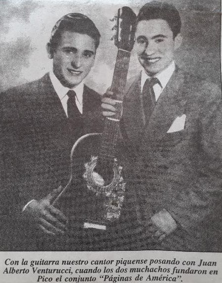 Juan Venturucci y los grupos que integró. Música es ritmo, melodías, sonoridad, silencios... los cuales son más fáciles de sentir y reproducir, que de generar, y como nuestra consigna es rescatar para preservar pero de generar no sabemos, recurrimos a quienes han sido íconos de una época, en este arte para mantenerlos vigentes, para que su producción o su recuerdo no se pierda, por eso a sugerencia de gente que lo conoce y lo admira, lo llamé a Juancito, (como lo conocemos comúnmente) en otro de los momentos difíciles que le ha tocado transitar, debatiéndome si hacía lo correcto o no al llamarlo, pero al instante me atiende con su voz jovial e inmediatamente acepta la propuesta de aportar su testimonio para la página de la Junta de Historia de Pico. Así una hermosa mañana de diciembre de 2017, Juan Alberto Venturucci llega acompañado de su amigo y compañero de veladas musicales, Rubén”Beto” Arroyo, para dejarnos su aporte. Luego de intercambiar saludos pregunto: – ¿Me van a contar por qué andan haciendo juntos hoy? –Hoy en día estamos haciendo muy poco, por cuestiones de salud de uno u otro o de nuestras esposas. –Empezamos con problemas de salud, y eso ha hecho que no podamos reunirnos con la frecuencia de antes... – ¿Cuántos años hace que andan con la música? Juan responde a la pregunta: –Yo, hace 70 años… – ¿Podemos saber la fecha de nacimiento y el lugar? –Nací el 2 de Febrero de 1934, En Miguel Cané, o sea que soy pampeano de pura cepa. – ¿Y don Arroyo Ud.cuando nació y donde? –nací el 15 de septiembre del ´45, en General Pico. Soy bien píquense. – Cuénteme Juancito de esos años mozos, de juventudes, de trabajo, ¿Qué recuerda? – Nosotros de Miguel Cané vinimos en el año `42. Yo tenía 8 años, y fuimos a vivir atrás de la vía, a media cuadra de la plaza España. Hice parte de la primaria en la Escuela de “Itria”. Luego nos mudamos a la calle 15 entre 24 y 22. Ahí mi padre puso un negocio, una despensa. Además fabricaba chorizos y otros embutidos. De muy chico comencé a trabajar en lo de Vivalda. Ahí fue donde me conocí con “Roberto Palmer” (Roberto Paglia), este muchacho que fuera integrante de los “Quilla Huasi”(1), fui a la escuela nº 64, y completé hasta el sexto grado. Trabajaba un tiempo con mi padre y después en lo de Carlos Vivalda, que tenía almacén y Bar, en la esquina misma de 15 y 24. Con Roberto, recuerdo que teníamos un cajón de lustrar a medias… – ¿Eran lustra botas también? – Si, lustrábamos zapatos. Cuando yo iba a trabajar al almacén, él lustraba zapatos. Nos turnábamos y así empezamos con esa sociedad. Más adelante él comenzó a aprender a tocar la guitarra con Juan Cabrino. – Tendríamos 12 o 13 años y los dos íbamos a la academia de “Deballi” donde aprendíamos máquina y contabilidad. Con La máquina de escribir había que aprender con los diez dedos, y sin mirar. Te recibías con 105 palabras por minuto. – ¿Ahí también empezaron a estudiar música? – Juan Cabrino ya era cantor de una orquesta, Roberto empezó con guitarra, y como a mí me gustó, entonces me empezó a enseñar. La enseñanza no era muy metódica, era una enseñanza muy básica, cómo tomar la guitarra, unos tonos y después arréglatelas como puedas. – Todo se hacía de oído, recuerda y se ríe. – No pagábamos nada para que nos enseñara. Era una cuestión de amigos. Entre los tres, con Cabrino y Paglia, formamos el trío, “Paginas de América”. Ese nombre,surge por ocurrencia de Celso Acevedo en ocación de visitar la propaladora para hacer la Publicidad Claridad,por que hacíamos música de toda América. Hacíamos folklore, tango y toda la música centroamericana, por eso le pusimos “Páginas de América”. ¿En qué año armaron “Páginas de América”? – Eso fue en el año `48 me parece... – ¿Y salían Fuera de Pico? ¿En que se trasladaban? –En colectivo y en tren, porque llevábamos nada más que la guitarra. Íbamos a Santa Rosa, Catriló y otros lugares donde nos contrataban. – ¿Recuerda el debut, cuando se iniciaron en público? – Sí, fue en el bar Fernández, en la calle 17 esquina 20. Era el bar más popular y más céntrico. Esa noche actuamos ahí, en el palco del reservado que había en un costado del salón. Por suerte actuamos muy bien, íbamos asustados porque era la primera vez que nos presentábamos en público. ¡Si, teníamos un miedo pero nos fue muy bien! Es que el conjunto andaba bien. Roberto cantaba muy bien, Cabrino lo mismo, tocábamos la guitarra los tres, así que nos defendimos bien aun que esa noche nos faltó Cabrino por que tenía "una cita ineludible"(agrega con picardía). La primera canción que cantamos fue “Luna tucumana”, de Atahualpa Yupanqui – Nos había contratado el dueño del bar, el señor Fernández. – Y otra pregunta, ¿Les pagó la actuación, y cuanto? – ¡Si, si! No me acuerdo bien si eran 5 o $10.-, pero era linda plata. Aparte era el primer trabajo que cobrábamos, claro. Para darnos una idea digamos que la carne valía $0,70 el kilo, un pantalón $1,20. Claro, se vivía tan barato, con tan poco se vivía. Es que no había las cosas que hay ahora. – ¿La música que tocaron esa noche, era folklórica? – Sí, pero hicimos centro americano también, pero no bailaron porque era un reservado, se lo llamaba “Salón Familiar”. Del otro lado estaba el bar donde además estaban los billares. –Y seguimos así con el trío, mucho tiempo. Hasta el año ´55 en que a mí me toco hacer el servicio militar en la Marina, en Puerto Belgrano. Punta alta. Casi tres años estuve ahí. Mi destino fue la Comandancia. – ¿Y cómo lo trataban? – Yo la pasé bien, muy bien. – Tiene buenos recuerdos del Servicio Militar? – Sí, buenísimos recuerdos, no me puedo quejar. Y te cuento una anécdota, yo volví a entrar en Puerto Belgrano, de la mano del señor Corrales, porque él era oficia