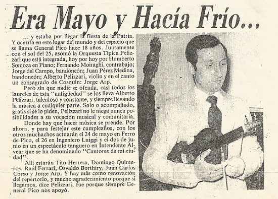 Nuestros Músicos Miguel Alberto Pelizzari Hace algo más de un año, estuvimos con Cristian Rodríguez, en casa del maestro de música Humberto “Beto” Somoza, quien nos ofreció para que podamos escanear una cantidad enorme de fotografías y como estaba tratando de ordenar “su archivo” personal, tenía mucho material que consideraba inútil, a lo que le solicitamos que era mejor ordenarlos y luego sí, ver qué destino se le podía dar. Así fue como aparecieron notas, reportajes realizados por sus alumnos a personas que tenían que ver con la música, entre algunas carpetas que llegaron a mi poder. Anoche, 21 de junio de 2018, buscando otros datos, encontré algo que nada tenía que ver con lo que buscaba, pues se trataba de unos reportajes y decidí publicar este por tratarse de un amigo personal de Humberto y al mismo tiempo buen amigo de muchos. Además, al pedirle autorización para publicarlo en nuestra página de la Junta, aproveché para interiorizarme de estado de salud de este buen amigo, “Beto” Somoza que no está pasando por un buen momento. Logrado todo ello y luego de haber llegado hasta el domicilio del maestro, para solicitarle un par de fotos como para acompañar el informe, me pongo a transcribir este reportaje que le hiciera, supongo que una jovencita y hace ya unos cuantos años, al maestro Alberto Pelizzari, en trabajos que Somoza solía pedir a sus alumnos, especialmente con personas que tuvieran que ver con la música. El nombre de la alumna es IVANA SOLEDAD HERNÁNDEZ, el papel está dañado pero parece decir; 2º III, y dice así: xxxxxxxxxxxx Historia de un músico piquense: Su nombre Miguel Alberto Pelizzari, nacido en General Pico el 16 de noviembre de 1944. Su bisabuelo era italiano, de los primeros pobladores, con esto vemos que su familia era ya desde hace mucho tiempo, nativa de esta tierra. De chico le gustaba jugar al fútbol, pelota a paleta y además tocar el violín. Nos cuenta que desde los 6 años veía la orquesta de su tío como ensayaban, de ahí su vocación por ser músico. Su primera presentación en público fue a los 13 años de edad, en los escenarios bailables, hasta la actualidad. Nos cuenta que cuando empezó el público lo recibía con simpatía, porque según él, cuando la gente ve a un chico en el escenario lo recibe con cierta simpatía. También nos cuenta que a un músico, la música le hace conocer muchos lugares, escenarios, público, pero también muchas veces las orquestas tienen sus contratiempos. Pero como en cualquier otro trabajo uno aprende que no hay que desanimarse. Quien verdaderamente quiere a la música, deberá saber que hay escollos y hay que sortearlos para seguir adelante. Su declaración nos obliga a ver que no hay que desanimarse, al contrario, seguir cuando se está convencido que la música está por sobre cualquier otra actividad. La música también brinda otras satisfacciones, –continúa–, pero solo si se toma el trabajo con seriedad, es decir ensayando y respetando al público y a la música misma. Nos cuenta el maestro que la música que más prefiere, es la ciudadana, el tango por excelencia y siempre que estén bien ejecutados o al menos con ganas, ente ellos son de su preferencia; “Los Mareados”, música de Juan Carlos Cobián, “Recuerdo” música de Osvaldo Pugliese, “Adiós Nonino” de Astor Piazzola “La vi llegar” con música de Enrique Francini y letra de Julián Centeya. Para finalizar el maestro Pelizzari nos dice que ejecuta la música porque le agrada como ya dijimos y piensa que a su familia no le desagrada el hecho de que sea músico, aunque mentalizado de que a corto plazo deberá dejarla, si algún problema físico se lo impide. HISTORIA DE LA ORQUESTA DE ALBERTO PELIZZARI La orquesta se formó a mediados del año 1972 y en 1973, comenzamos a actuar en público. Los primeros músicos fueron: Humberto Somoza, Piano. Juan Pérez Medina, Bandoneón. Juan Carlos Sarán, Contrabajo. Alberto Pelizzari, Violín. El cantor era Raúl Ferrari y posteriormente lo hicieron Juan Carlos Corso y Tito Herrera. A partir de 1982, colaboraron varios cantores locales. Entre todas las presentaciones realizadas podemos citar algunas como la realizada en Cosquín, acompañando a los cantores locales. También hemos actuado en radios, televisión y destaco que sabemos colaborar cuando se nos requiere, para alguna institución, o personas que necesiten juntar algún fondo. Varios fueron los músicos que integraron la orquesta durante 21 años de formación, y cito algunos: Enrique “Tato” Ledesma Eberto Benuzzi E. Medina Jorge Del Campo Mario Bonassera B. Alzamora L. Klear. El informe de la joven IVANA SOLEDAD HERNÁNDEZ, se complementa con un par de recortes de un diario al que no puedo identificar, pero por los tipos usados, se me ocurre que puede ser del diario La Reforma. Uno de ellos lo transcribiré tal cual lo estoy leyendo, mientras que el otro lo “pegaré” como si fuera una foto. EL TANGO HOMENAJEA A ALBERTO PELIZZARI General Pico (DNA)–En la noche del sábado, en la sala de “El Viejo Galpón”, calle 17 número 540–, se concretará un espectáculo de tango, con el objeto de homenajear los 19 años de la Orquesta de Alberto Pelizzari, un músico sumamente conocido en toda la región, que mantiene firme la tradición de la música ciudadana. La noche de tangos con Pelizzari, comenzará a las 21:30 horas, y en el escenario de la remozada sala, –ahora convenientemente calefaccionada–, desfilarán varios de los músicos y cantores que al cabo de la trayectoria de la orquesta, fueron parte de la misma. Entre estos últimos, acompañarán al violinista los conocidos Juan Carlos Corso, Oscar Arp, Tito Herrera, Raúl Ferrari, Abel San Martín y Domingo Quinteros, entre otros. Autoría: Ivana Soledad Hernández Recopilación por Héctor Pérez Farías, miembro de la Junta de Historia Regional General Pico. Fotos gentilmente cedidas por el señor Alberto Pelizzari y 